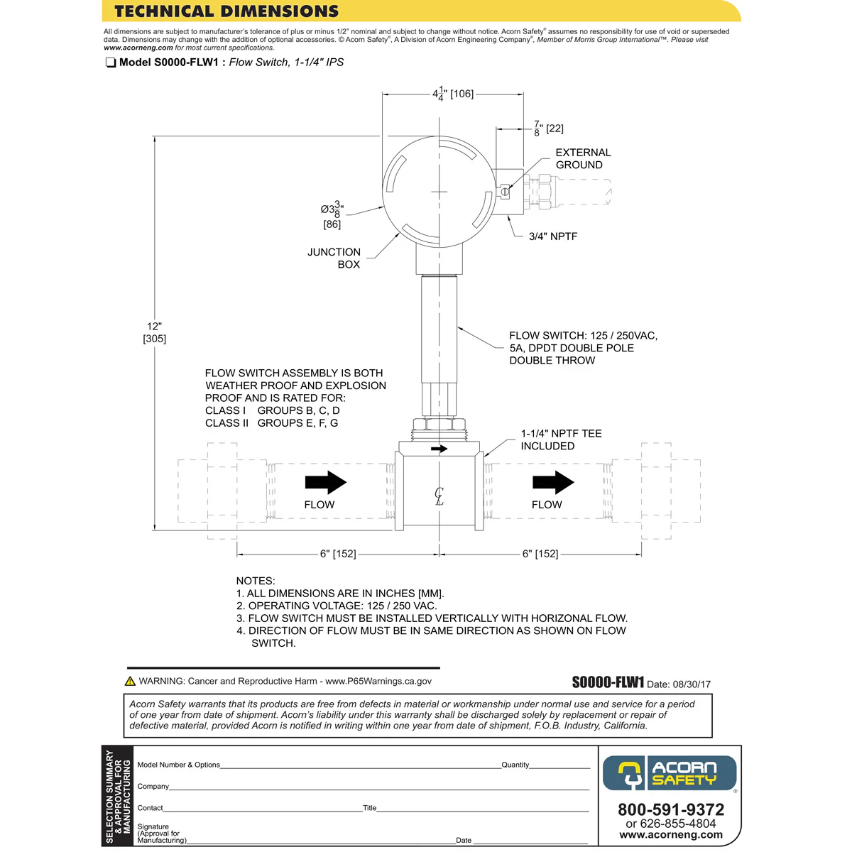 Model S0000-FLW1 is a 1-1/4" NPTI DPDT double pole, double throw flow switch has contacts which allow for remote monitoring (by others) and audio/visual alarms (by others). Switch is installed in the water supply line prior to the emergency equipment and is activated once it senses the movement of water in the supply line
