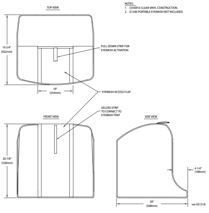 Cover: 16 gauge clear vinyl cover features stitched seams and velcro front flap for easy eyewash access. Front flap connects to eyewash tray with velcro strap for easy one-step activation.