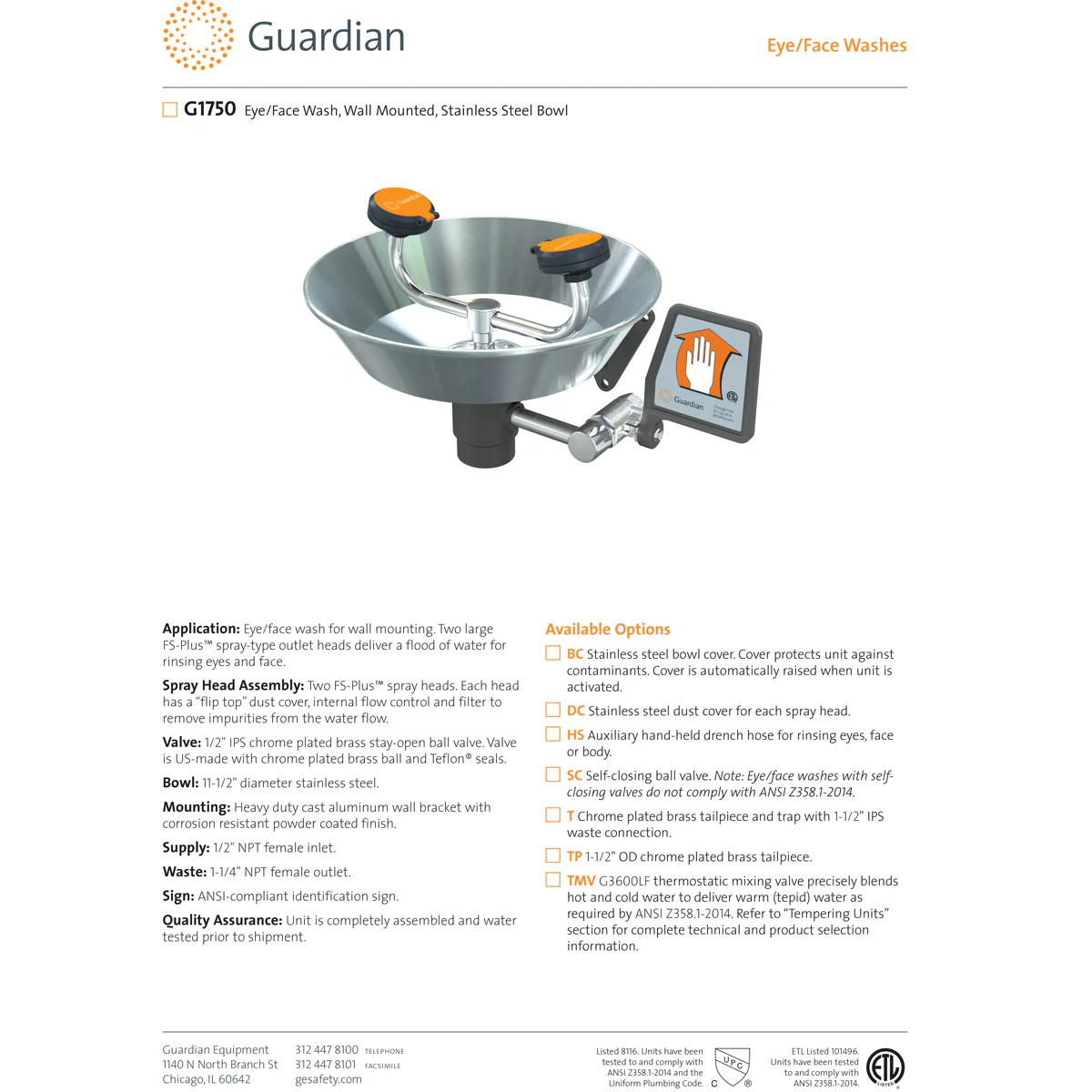Guardian G1750 Wall Mount Eye/Face Wash Station, Stainless Steel Bowl